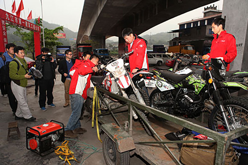 越野救護隊到達雅安后卸車準備騎車前行