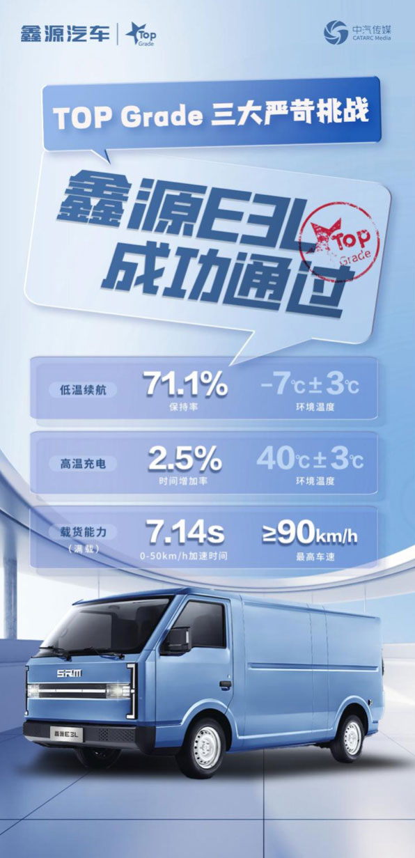 鑫源E3L在由行業(yè)權威機構——中汽中心舉行的“2024Top Grade頂級品質(zhì)挑戰(zhàn)”極限測試中,在嚴苛的測試條件下成功通過“低溫續(xù)航、高溫充電和載貨能力”三種工況測試并取得優(yōu)異成績。鑫源E3L在低溫續(xù)航保持續(xù)率、高溫充電時間及滿載加速的多項測試中,均取得優(yōu)異的成績,這不僅得益于鑫源E3L優(yōu)異的性能,也是搭載新一代寧德時代電池的出色表現(xiàn)。