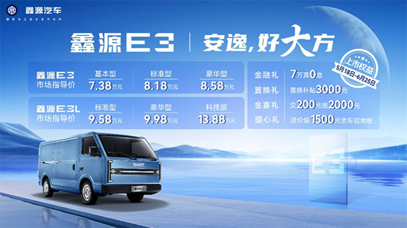 鑫源E3作為“安逸,好大方”全新車型,共推出鑫源E3、鑫源E3L兩個(gè)車型,分別有基礎(chǔ)型、標(biāo)準(zhǔn)型、豪華型、科技型等6款配置,指導(dǎo)價(jià)7.38萬元-13.88萬元。上市還推出新車上市權(quán)益包:1、金融禮-7萬真0息;2、置換禮-置換補(bǔ)貼3000元;3、金喜禮-交200抵2000元;4、暖心禮-送價(jià)值1500元全車鋁地板。鑫源E3以“一寸長·一寸強(qiáng)”、“移動(dòng)家·頭等艙”和“好·省”三大核心賣點(diǎn),為新能源城配物流樹立新標(biāo)桿!