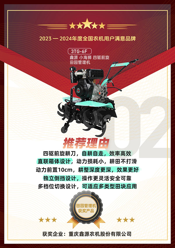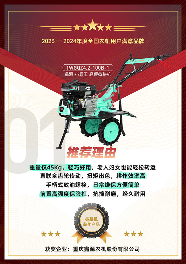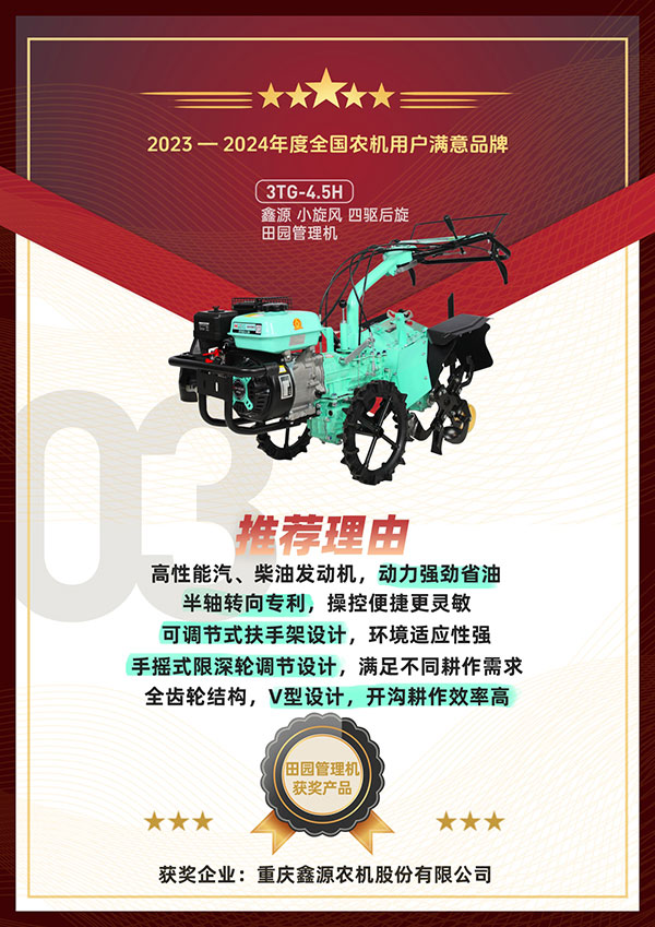 重慶鑫源農(nóng)機股份有限公司以良好的產(chǎn)品銷量順利入圍活動并參與評選。主辦方通過問卷調(diào)查、用戶投票以及專家評審等層層維度開展了嚴格篩選,最終鑫源小霸王輕便微耕機、鑫源小海獅四驅(qū)前旋田園管理機、鑫源小旋風(fēng)四驅(qū)后旋田園管理機等產(chǎn)品憑借眾多的用戶好評,優(yōu)秀的產(chǎn)品性能和質(zhì)量成功榮獲2023-2024年度全國農(nóng)機用戶滿意品牌。