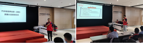 本輪質(zhì)量認(rèn)證范圍包含涪陵基地沖壓、焊裝、涂裝、總裝四大車間,啟動會在激昂澎湃的《鑫源之歌》中拉開序幕。首先由質(zhì)量控制部副部長張偉對生產(chǎn)系統(tǒng)質(zhì)量績效評價方案以及認(rèn)證方案進(jìn)行解讀,要求各車間進(jìn)一步明確質(zhì)量目標(biāo),按目標(biāo)開展工作行動,提升制造質(zhì)量水平。接著汽車制造事業(yè)部質(zhì)量總監(jiān)蘇總對活動認(rèn)證背景進(jìn)行說明及做出動員講話,最后開展了理論認(rèn)證的培訓(xùn)及測評。