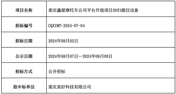 重慶鑫源摩托車公司平臺升級項目3D掃描儀已完成招標流程,現(xiàn)公示中標結果如下:
